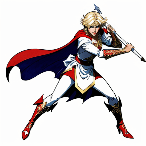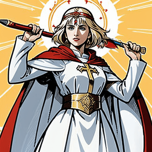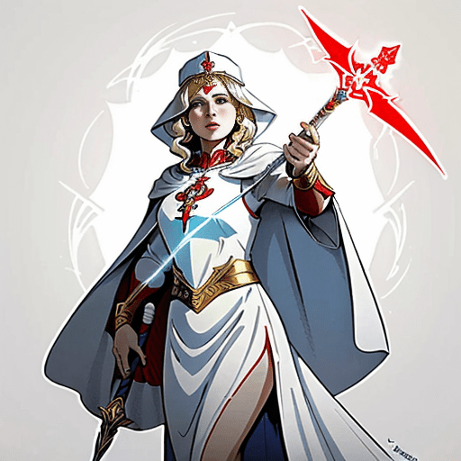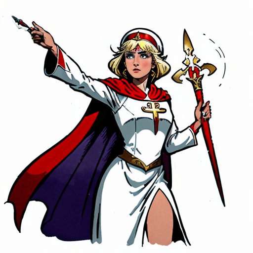 Positive prompt: a priestess woman defending herself with a holy staff held out in front of her, fending off attacks, looking defiant, in a cartoonish style, cropped blonde hair, modestly dressed, long white gown covering legs, red cape, religious garment, comic book art, drawn lines, ink and pencil, cel shaded, restore face