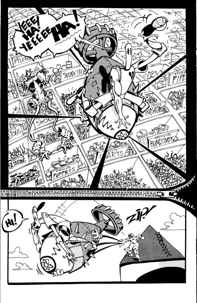 What amazed young me when I first picked this up was how well it worked. Like, it didn’t actually work, but because the action just rolled with whatever bizarre crap was going on, you had no choice but to just go along with it. I had never really read anything like that before; stories were hella scripted when they were just words, and when you involve actual comic artists, well, then you really see the planning involved. Not this one.