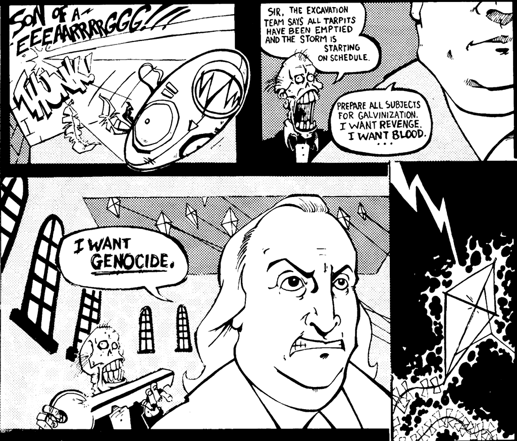Scud as a character is a bit uneven; he’s motivated by not self destructing first and foremost, but he also has a bit of a sense of justice, mostly along the lines of “I don’t care what you’re up to so long as you don’t mess with me.” Of course, being an action packed comic book starring a killing machine, others mess with him. One of them is Voodoo Ben Franklin. Who isn’t just styled after Ben Franklin, he is Ben Franklin. And he uses the power of lightning and kites to animate the dead. Like dinosaurs in a museum. Which he uses to eat the mafia for refusing to buy his zombies.