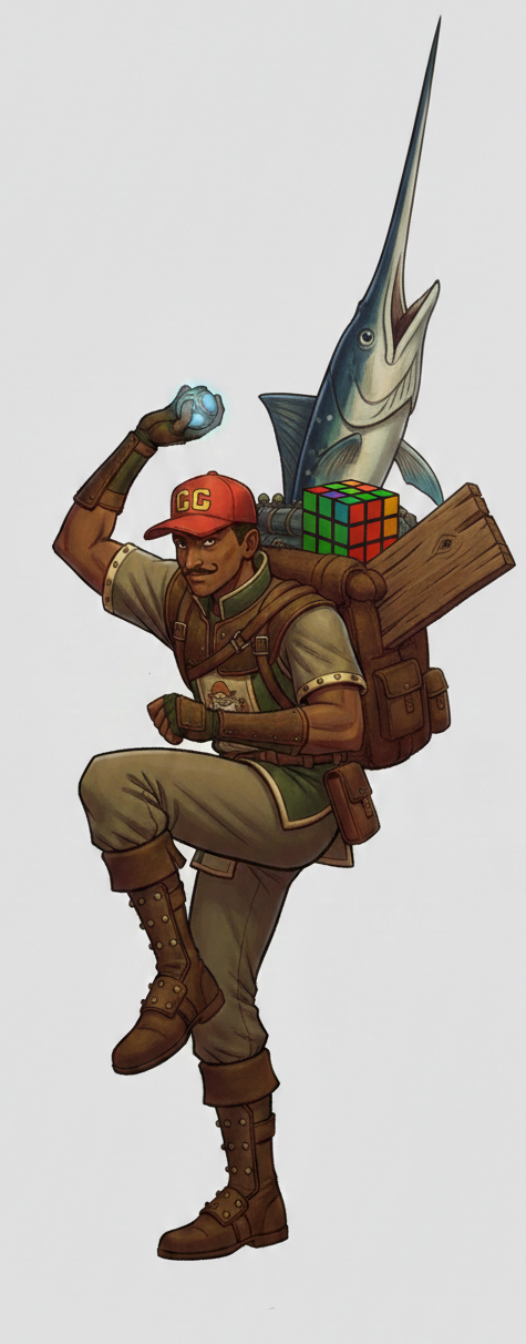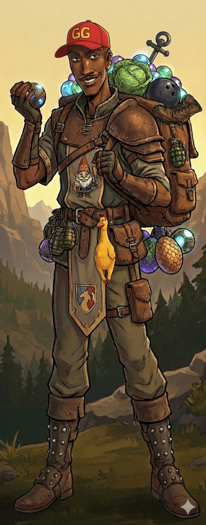 But first: An art! I fed the original Jo’Jaxon sketch into Gemini and kinda medievalled him a bit. The biggest change is instead of a generic baseball guy uniform, he’s kinda picked up a leather pauldron, a kickass rucksack.. and a guild tabard with the Gnorthwell Gnome on it.